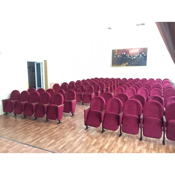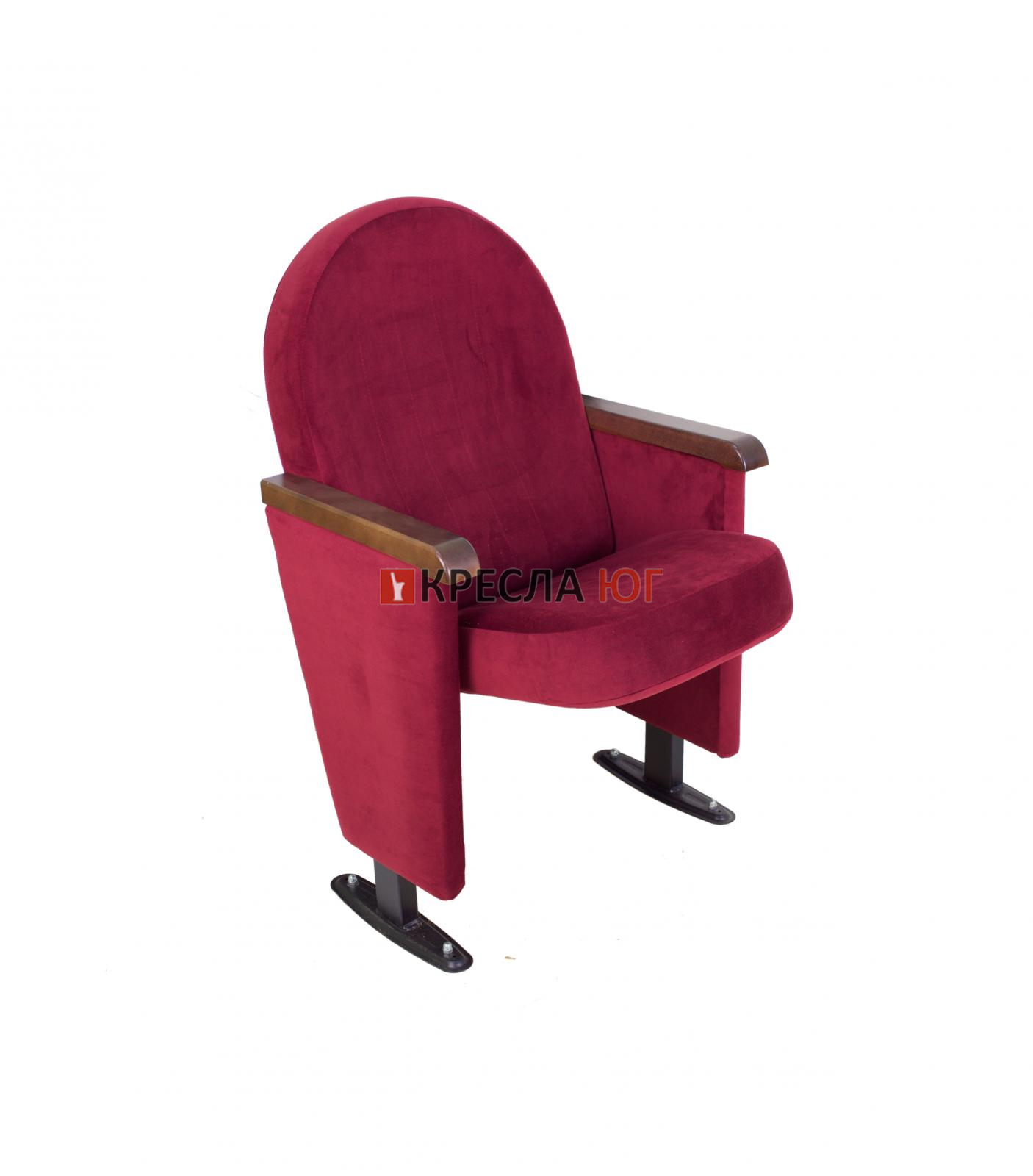 Кресло, с креплением к полу, в ткани, с подлокотниками, сиденье откидное, спинка скругленная.